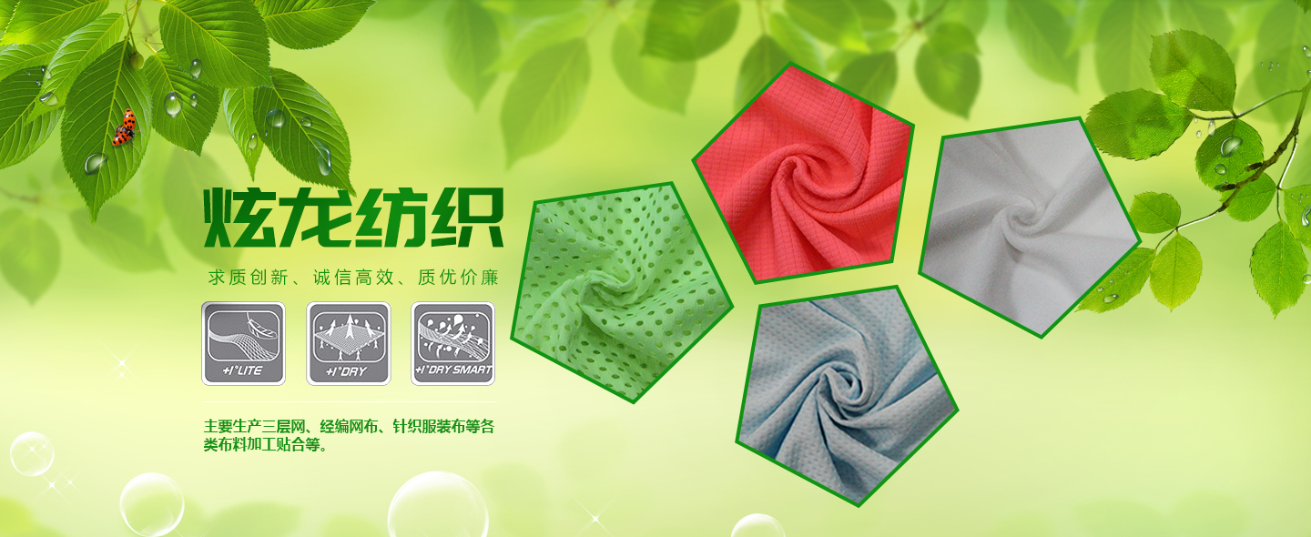 泉州市炫龍紡織科技有限公司位于中國福建晉江--中國鞋都,是一家集研發、生產、銷售為一體的紡織企業公司。主要生產:三層網、經編網布、針織服裝布、休閑時尚女裝網布、鞋用各類BK布、拉毛布、大小提花布、賈卡提花、3D飛織、各類布料加工貼合等。 公司秉承“求質創新、誠信高效、質優價廉”的經營理念為宗旨,竭誠為廣大海內外客戶求創一流的服務及優質的品質,歡迎海內外的客戶供樣、定制及洽談合作。